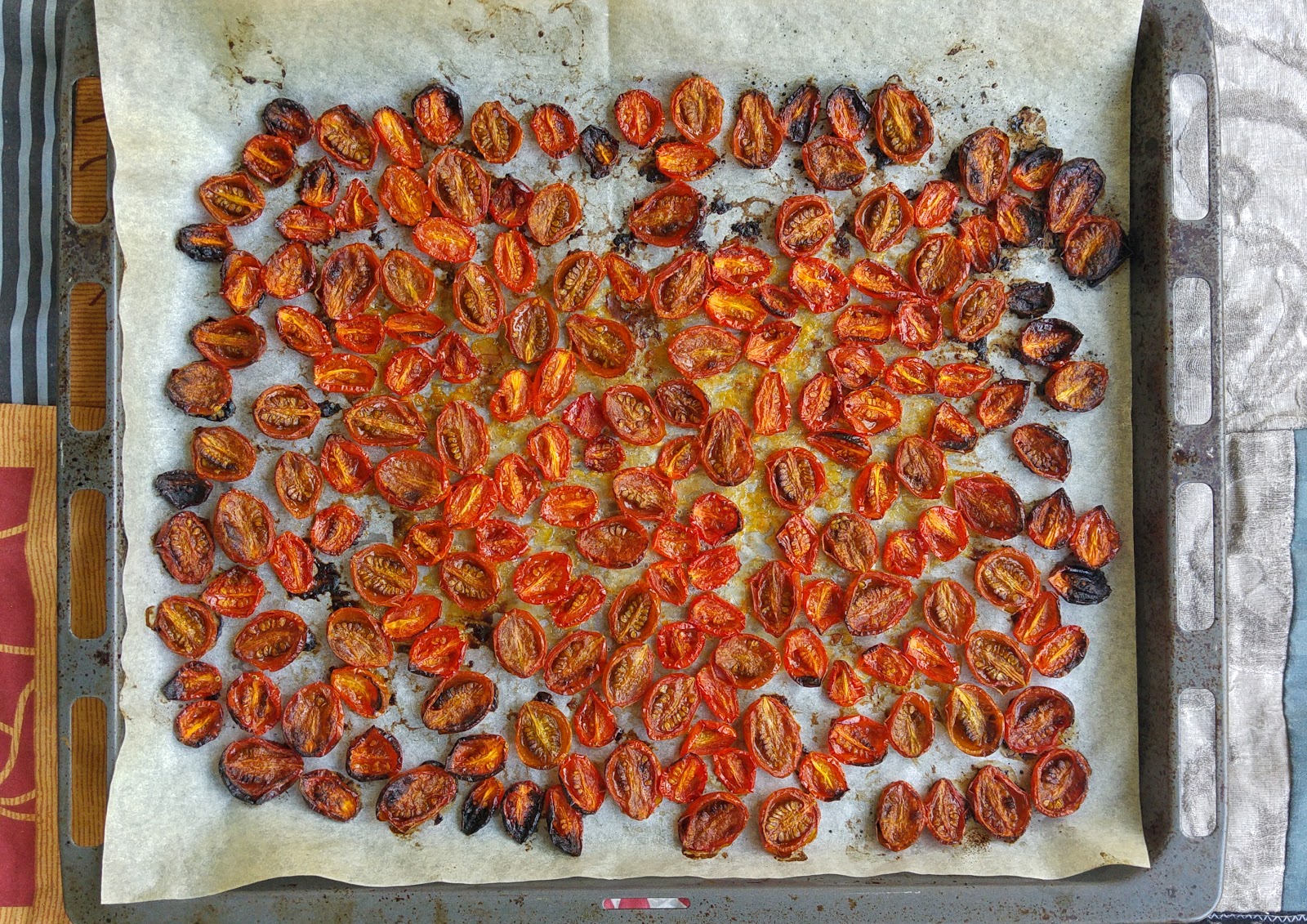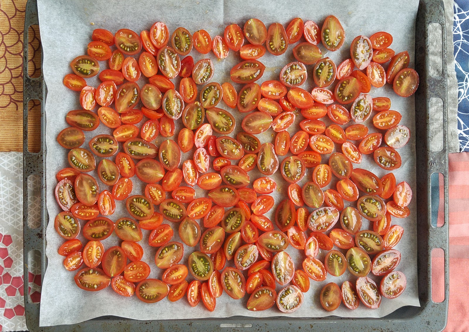 - פורסים את העגבניות לחצאים לאורכן. מניחים בקערה, בוזקים כ-2 כפות שמן זית, סומאק מלח ופלפל ומערבבים היטב. מסדרים עם תבנית לתנור מרופדת בנייר אפייה, כשהצד החתוך של העגבניות כלפי מעלה וצולים בטורבו במשך 40 דקות